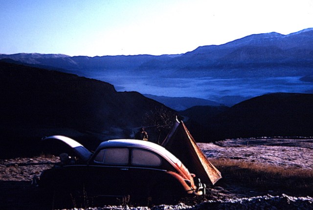 A stealth camp high in the mountains of Greece 1972. Note the frost on the car and tent.