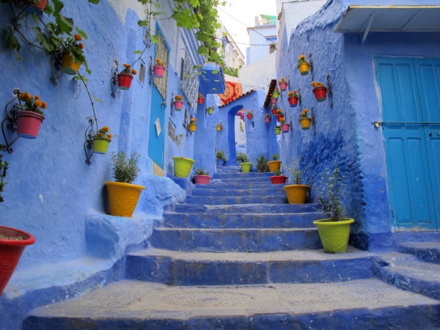 Chefchaouen was originally a Jewish town and to those of the faith blue represented heaven. It is well worth taking the somewhat dodgy bus ride to Chefchaouen from Tangier (port of entry) but you need to stay a week at least.