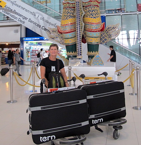 The motor is contained in the hub of the front wheel and the battery, a 250 watt 36 volt model is mounted just above the Tern logo. To date they have proved 100% successful with a range of around 75 kilometres between charges. The motors are made by Dillenger Southport Queensland Australia. The batteries are classified as dangerous goods and cannot be taken on an aircraft; they have to be sent to the cycling start point by an authorized freight company.