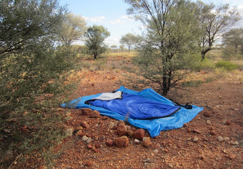 Most outback travellers use a canvas swag, which I think is bulky and unwieldy. Our swag, instead of being canvas is made from Goretex, which is lightweight, waterproof, breathes more efficiently than canvas and rolls into a smaller bundle. Primarily we bought it for sleeping in when backpacking in the wilds of New Zealand. Unless there is rain pending or there are a million mozzies about we always sleep under the stars.