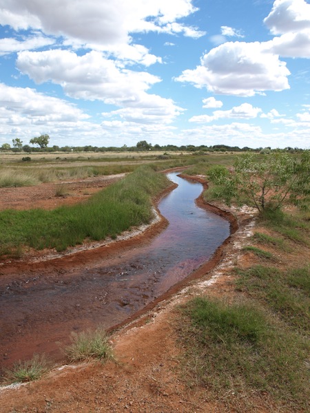 Water from artesian bores is discharged into bore drains such as this. They criss-crossed pastoral lands all over the Australian outback providing stock with drinking water. The system was cheap; the only cost was ‘delving’ (cleaning out) the drains occasionally. No need for piping, tanks or troughs. However this system wasted a lot of water through soakage and evaporation so now most free-flowing bores have been capped and regulated. The Great Artesian Basin provides the only reliable source of fresh water through much of inland Australia. The basin is the largest and deepest artesian basin in the world, stretching over a total of 1,711,000 square kilometres (661,000 sq mi), with bore head temperatures ranging from 30°C to 100°C. It underlies 23% of the continent, including most of Queensland, the south-east corner of the Northern Territory, the north-east part of South Australia, and northern New South Wales. Water in the basin is 3,000 metres (9,800 ft) down in places. There is evidence to suggest that waters gushing to the surface today fell as rain millions of years ago. The word ‘artesian’ pertains to Artois in France where similar bores to the ones in Australia were found.