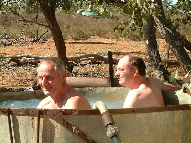 Having a hot artesian bore on your property not only provides cheap water but also provides hot water for luxurious outdoor bathing. Some towns like Lightning Ridge, Burren Junction, Pilliga, Moree and Mitchell make use of the hot flowing waters as a tourist attraction. People migrate from all over to bathe in waters said to be very beneficial to the health. Bev and I prefer the bush setups on properties like the one here showing two of our Swiss friends enjoying a dip.