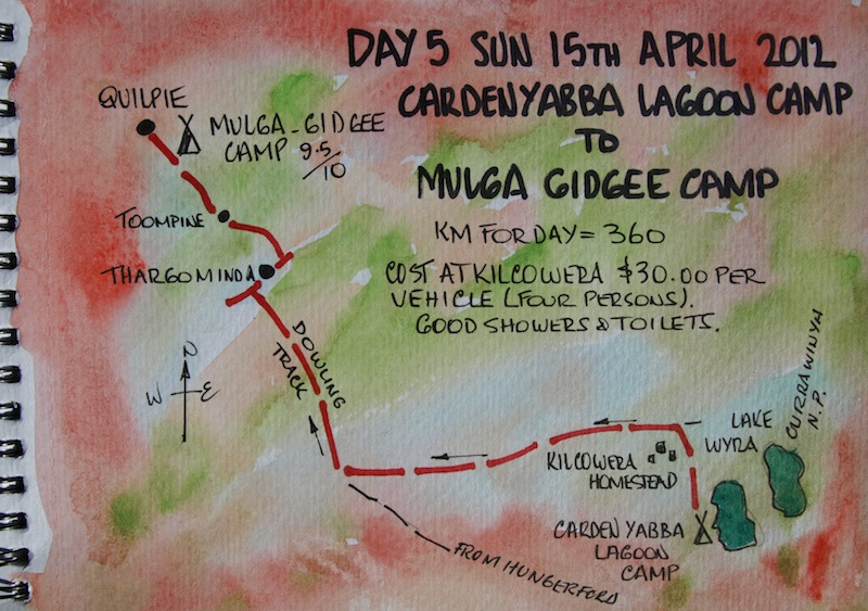 The search for a free bush camp began about fifty kilometres north of Toompine. After a couple of false starts we found a side-track to one of the most pleasing free bush campsites we have ever had in the forty years Bev and I have been travelling together. So desirable is it that I have given it 9.9 out of 10 on the Hillier arid camp scale. The campsite, which I will call the Mulga Gidgee camp, is on a quartz/silcrete ridge to the south of Quilpie overlooking a vast plain that extends to the Never Never. Country like this has a mysteriously ancient ambience about it and we certainly felt some of this at the camp.