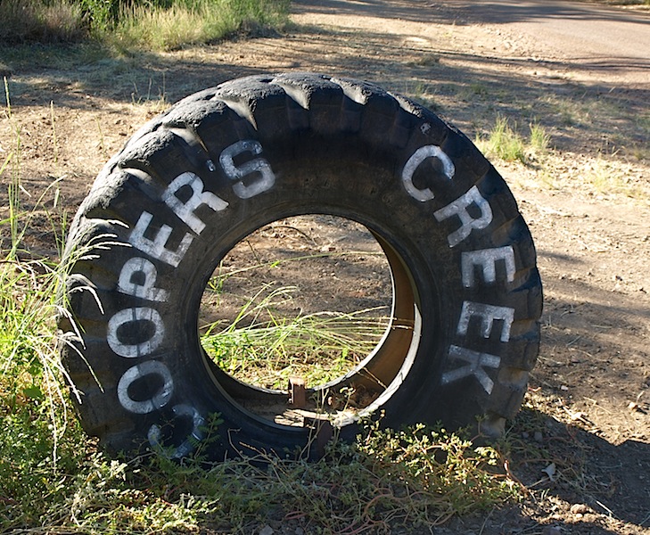 In the past there was a very flash colourful sign to let you know you had arrived at Cooper’s Creek but souvenir hunters stole it so the shire came up with a devious solution, a grader tyre filled with concrete.