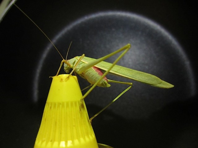 As best as I can determine, this is a Common Garden Katydid. Katydids are usually heard (they make a sound similar to a cricket) but not seen, they prefer to hide in foliage and are experts in camouflage. If this is the case we were lucky to see this chap. When insects invade our camp at night I wonder if there are some that have never been identified.