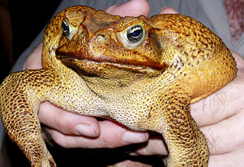 ‘A cane toad the size of a small dog has been caught by a pest eradication group in the Northern Territory. Frog Watch, a group culling the introduced menace across the Northern Territory, has found a toad measuring 20cm long’. A spokesperson for the group said, ‘I reckon I’ve probably seen 50,000-60,000 cane toads in the last 12 months and there is nothing even remotely close to this thing 20cm in length and weighing 860gm.’ The Bufo photograph is courtesy of the Daily Telegraph.