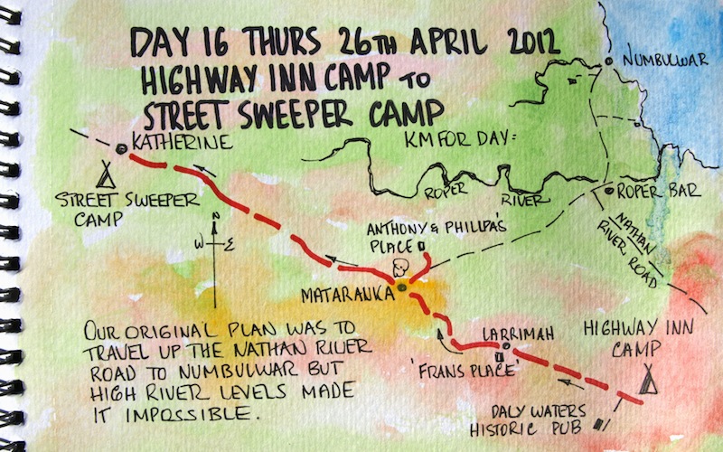 Aaron, the long distance bike rider, was at Fran’s when we got there; he was fuelling up on scones, mango jam and cream. I asked him if he was averse to accepting rides in cars, he replied in the negative so we hoisted his bike on top of our kayaks and took him on to Katherine from where he intended to ride to Darwin and see if he could hitch a ride on a boat to Asia.