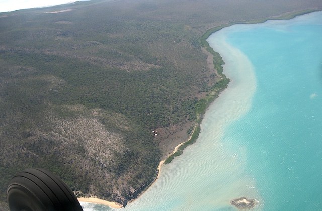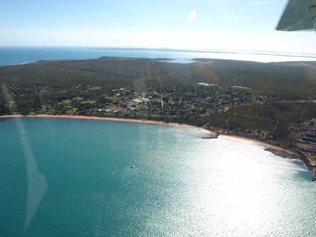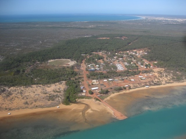 Umbakumba is on the southern edge of Little Lagoon. In the lower centre of the photo is the barge ramp extending into the lagoon. The closest mainland community to Groote Eylandt is Numbulwar. Barges ply between Umbakumba and Numbulwar on a regular basis.