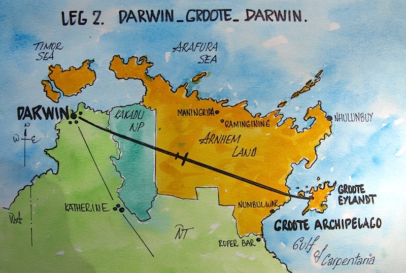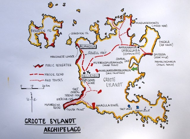 On the Groote Eylandt Archipelago map the areas marked in red are the only areas where workers and visitors such as us are permitted to visit without a traditional owner. Sometimes an area can be closed when there has been a death in the family whose land it is. The area is opened again once the spirits of the deceased have been appeased.
