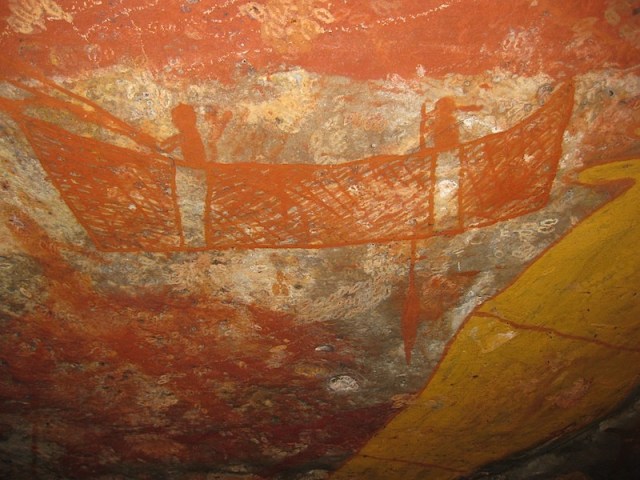 Before the arrival of the Macassan traders from Sulawesi in the 18th century canoes were made from bark. This painting depicts such a craft.