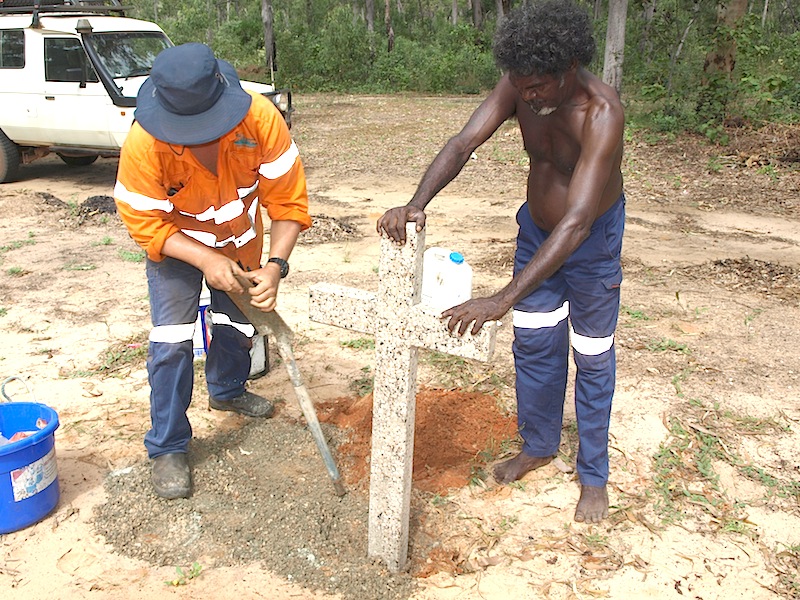 Last year I made polished concrete headstones and crosses for the locals to mark graves. It wasn’t until the 1960s that Aboriginal people were allowed to mark graves.  In the Northern Territory there are around 6000 unmarked Aboriginal graves.  Aboriginal people on Groote are just as passionate about their ancestry as whitefellas and so having graves marked is important to them.