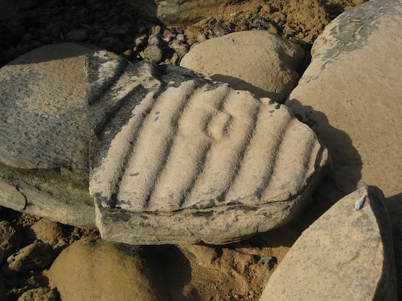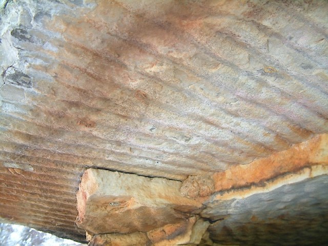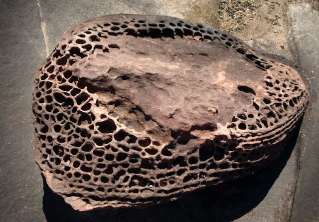 Most sandstone is composed of quartz and feldspar (the most common minerals on the earth’s crust). Sandstone is porous and therefore the percolation of water through the rock results in hard and soft spots. Maybe the holes and rills are where soft spots were.