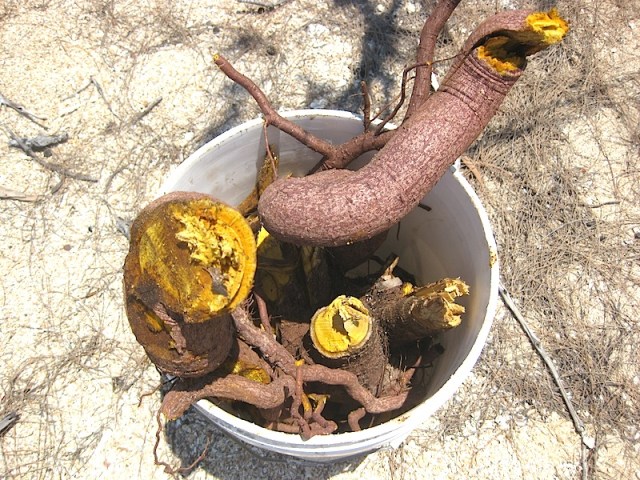 Roots used for dyeing. The roots are smashed almost to a pulp then boiled along with the pandanus leaves.