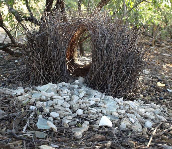 This belongs to a Greater bower bird. For readers not familiar with bower bird antics it goes like this: the male of the species gathers material objects and decorates the entrances to his bower with them with the plan to lure a female through the bower so she can see how conscientious he is in being a provider. Bower birds in isolated locations such as this one usually have no human objects in the bower other than a couple of pieces of broken glass. In more populated areas they gather all manner of objects including bottle tops, tech screws, cable ties, colourful electrical clips, in fact any piece of colourful object they can get their beak around.