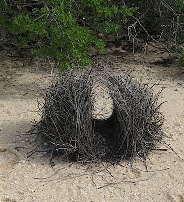 Note that this bower has no material objects to attract the female. The male belonging to this must think having a beachfront location is sufficient to attract a female. The act of a female passing through the bower indicates she is suitably impressed and is prepared to mate. I have been called a bower bird because of my habit of collecting stuff for recycling.