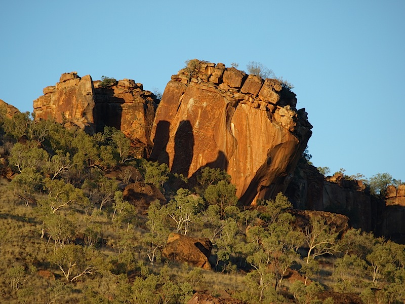 This morning we awoke to a breezewhispering through the trees carrying with it the distant howl of a couple of dingoes. I expected to hear from dingoes here as the surrounding cliff faces are dotted with caves, just the sort of place for lairs. There seems to be little evidence of wildlife around for dingoes to prey on, I expect they live mostly on road kill. This morning Bev and I went for an early morning walk through recently burnt country and because there was no grass the country was laid bare, skeleton-like. I have no need to write a description of what the landscape looked like, the following photographs do the talking.