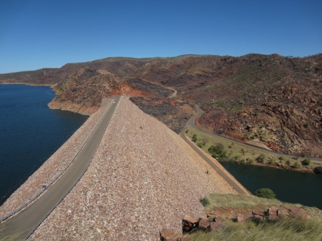 The big event today other than poking around the burnt boab country was a visit to the Argyle Dam. The wall is not Hoover Dam in mass or size but it is impressive and it does hold back a mass of water, twelve times the amount in Sydney Harbour if that means anything to you. The geological formations surrounding the dam are awesome; it is impossible to imagine how much force was required to sculpt the countryside.