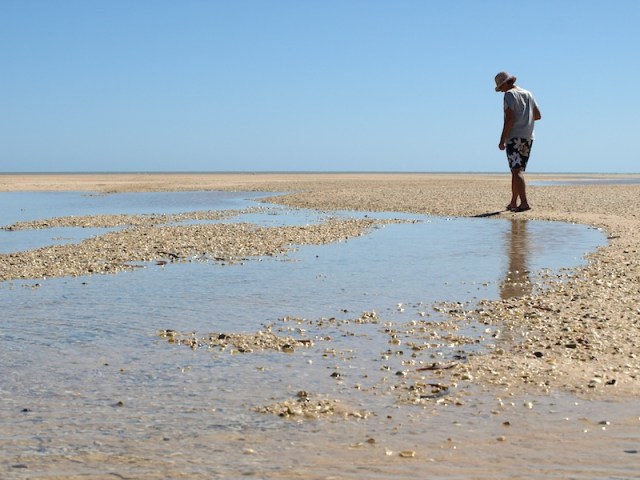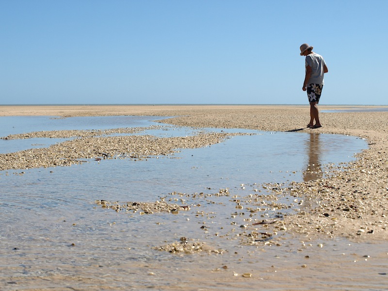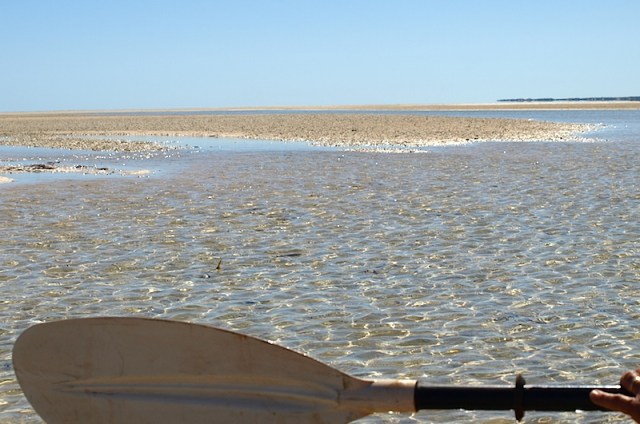 Paddling was not the most comfortable due to the wind. Water that drips off Bev’s paddle blows back onto me so I end up drenched, however it was good exercise battling the wind. After Monkey Mia we found a sheltered spot to do a second launch and paddled in a creek leading into Little Lagoon. The tide was running out so we skipped along at a steady rate and found ourselves on an exposed sandy estuary where the lake runs out and meets Shark Bay proper. Even though we were only on the water for about four hours it was a good day.