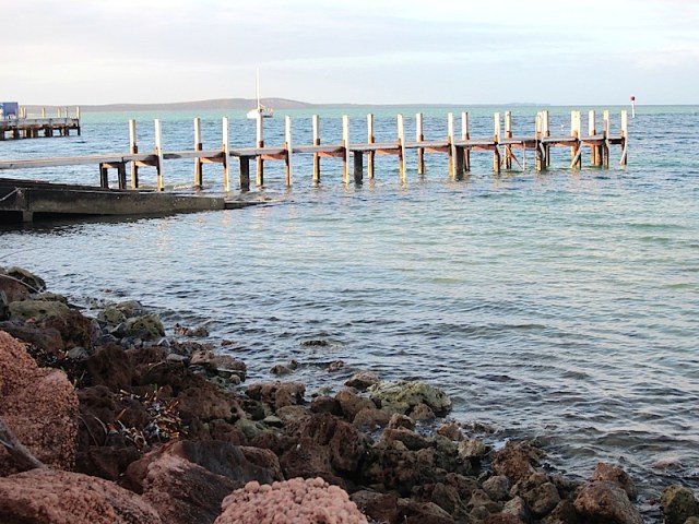 Denham town is located on the west side of the middle peninsula. Map orientated north.
