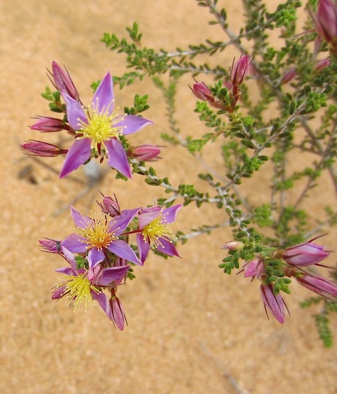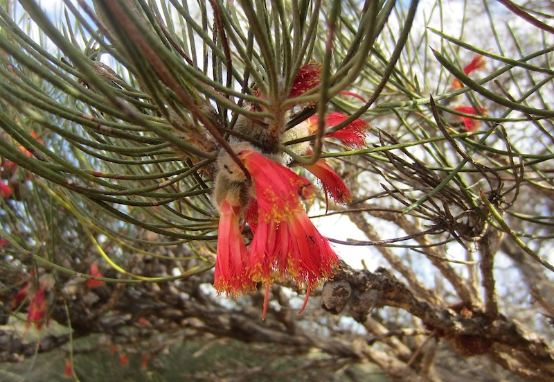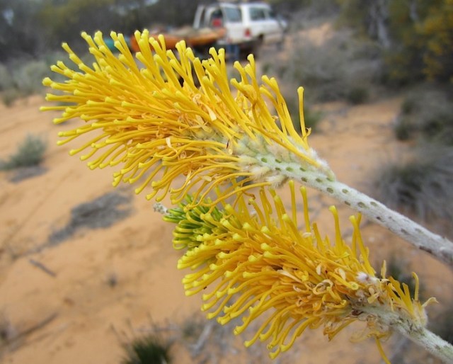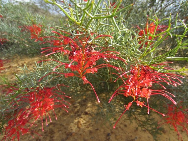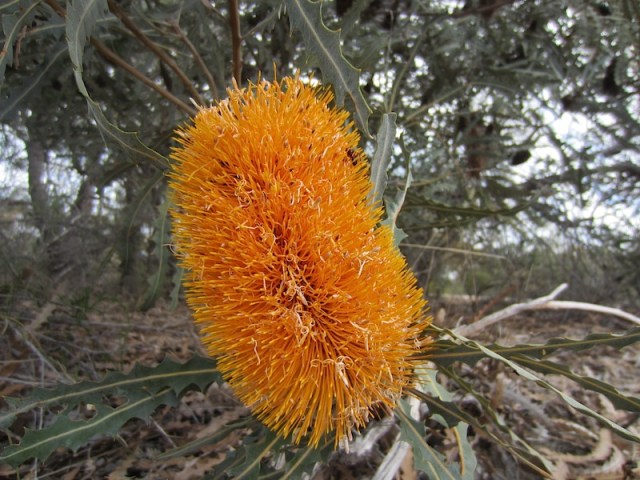 Heading for Kalbarri, the next big town on the coast, we spotted our first gum trees since travelling for hundreds of kilometresEven though they were stunted mallee they were a change from the monotonous coastal shrubby heath country. Bev spotted an orange banksia and I had to stop so she could photograph it. Driving off the road onto another track we came across the most delightful collection of wildflowers. We found cypress, banksia, a variety of acacias, Geraldton wax, grevilleas and a myriad of shrubs new to us. Tomorrow if we are about Kalbarri we will visit the national park office and see if we can identify them.