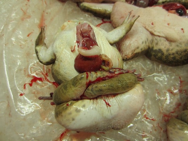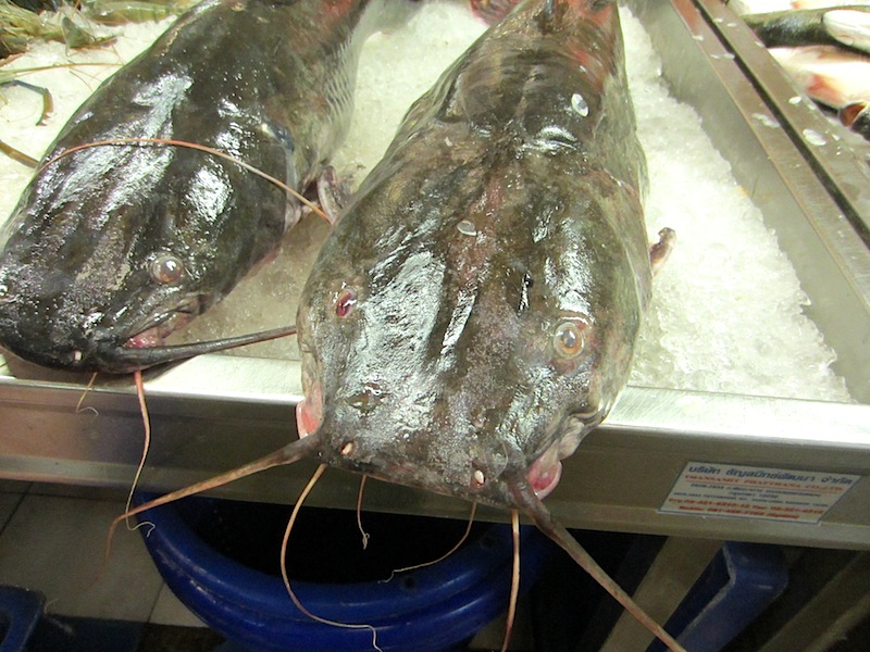 These catfish were about a 1.3m long. Note the width of the head in comparison to the bucket under the table. When you cook catfish you skin them like you do an eel.