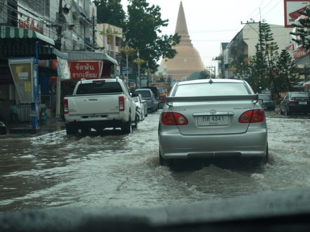 Thai cities are notorious for local flooding, mainly because of blocked drains and klongs. The big problem is associated with the floating weed, water hyacinth, which builds up under bridges and acts like a cotter dam forcing water to flood out. One of Thailand’s kings brought a piece of the plant to Thailand, broke it into pieces and gave it to his servants to propagate and now it’s out of control.