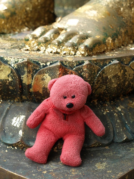 I did take photographs of T Bear in the hands of a Buddha but afterwards found out it was disrespectful of me to do so. Also of interest there were flowers that looked like marigolds placed as offerings around the stupa. Bev smelt one but was informed that sniffing the offerings was also disrespectful. However foreigners like us are forgiven as we don’t understand the protocols.
