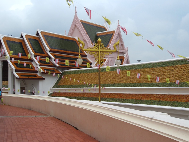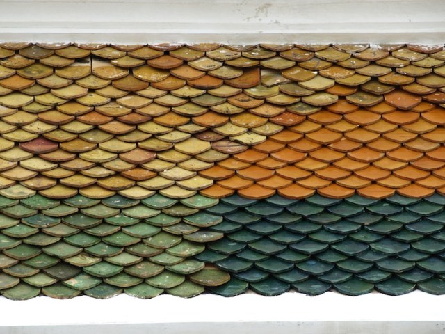 If you have laid bathroom or kitchen floor tiles lately you have probably used tiles made in Thailand. The Thais are experts when it comes to tile making because they have been at it for thousands of years. The wall here and the roof of this temple are glazed tiles. At present there are thirty-two tile factories in Thailand making and exporting tiles to countries all over the world.