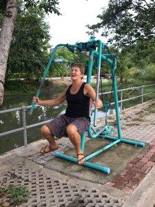 Next to Sirilug’s house there is a canal (klong) and along the bank are heavy-duty exercise machines for adults and children. Bev decided to get herself into condition.