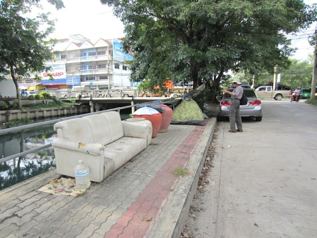 Thailand is not only the land of smiles, but it is a land of contrasts. The homeless setup here is an exception as you do not see a lot of camps like this one. Maybe the camper is an eccentric and he simply wants to live a minimalist lifestyle. A bit public, though!