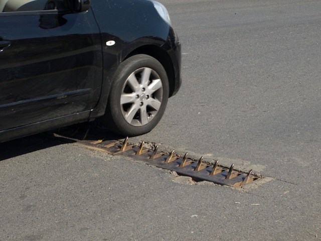 Some drivers in Istanbul ignore one-way signs and drive against the traffic so authorities have installed these nasty devices in an attempt to change their minds. The car here is travelling in the forward direction, left to right.