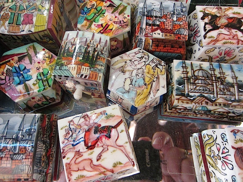 Bookselling as a profession emerged in the 14th century but it wasn’t until the Grand Bazaar was completed in 1460 and stalls were allocated that books were available in one central location. Prior to this, men who sold books were called ‘bundlers’. They walked around the streets hawking books from bundles on their backs. The 1894 earthquake devastated the bazaar and the booksellers moved to their present location where they have been ever since. Unfortunately in 1950 the bazaar, along with many books and manuscripts, was turned to ash when a fire swept through the area. Today the rebuilt bazaar houses twenty-three shops and it looks every bit as much as it did prior to the 1950 fire. Mustafa’s shop is loaded with treasures including postcard reproductions, bank coins and notes and other curiosities including beautifully decorated miniature camel bone boxes. Mustafa gave us two old coins as a gift and Bev bought a decorated bone box to add to her collection at home. Thanks again, Mustafa, for permission to include the postcard images in this leg of our blog. If any blog readers go to Istanbul be sure to call and see him.