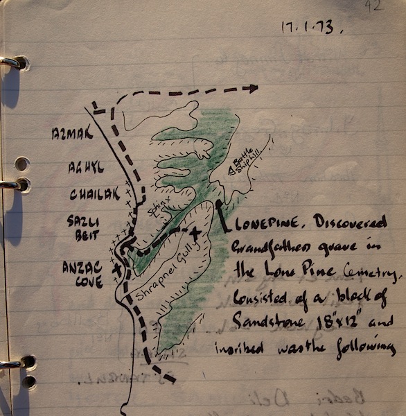 In 1973 Bev and I spent three days in freezing conditions searching for my grandfather’s grave and just as I was about to give up Bev suggested we visit Lone Pine cemetery and, sure enough, we found it. Standing there in front of the grave I realised I knew very little about Arthur, my grandfather, as my father was only seven when his father was killed and he didn’t really know him either. For me it was a frustrating experience not knowing, so I decided there and then to keep accurate records of my daily doings so my descendants will not experience the same frustration. I now have over thirty-five A4 size journals on the shelf. My eldest granddaughter (5) sits with my journals and thumbs through them looking at the photographs, so already there is a spark of interest.