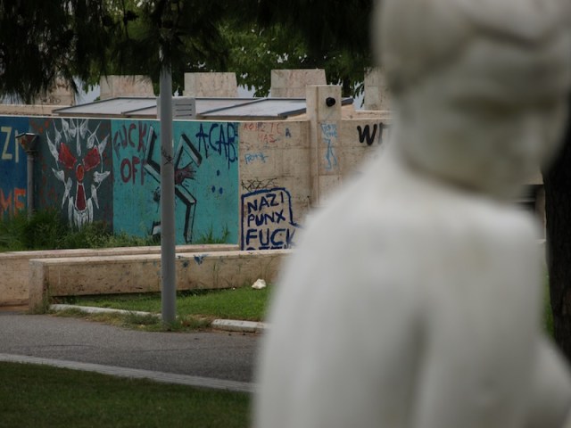 The scourge of graffiti has struck Greece. I have not seen as much anywhere in the world and that includes Sydney. Undoubtedly most of the graffiti has a political message. Unfortunately marble, from which most of the public buildings are made, makes a great contrasting surface to decorate.