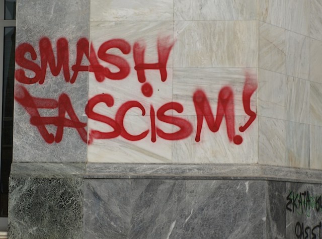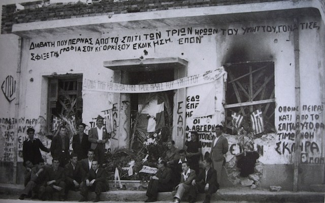 The photograph shows a graffiti-strewn wall on a house just after WW2. I don’t know what the writing says. Maybe one of our Greek friends can enlighten me, I hope it’s not unsavoury.