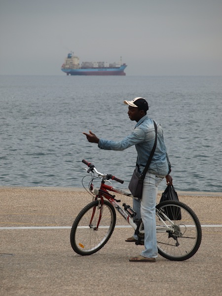 There are a lot of black Africans in Thessaloniki. Many are students and others refugees. Some are obviously short of money as they have turned to street hawking, selling all manner of goods ranging from electronic gadgetry including iPods and iPhones to leather belts, walking poles, watches and cosmetics. We learned early not to sit on the outer edge of outdoor café areas because you are too easy a target. All the hawkers have a sob story and no doubt many of the stories are true. I asked one bloke if he would ever go back to his country Senegal and he said he had no passport and he was stateless. We can’t comprehend being in a situation like that. It’s just as well Greece has a sympathetic attitude to these homeless people otherwise they would suffer even more. I gave one bloke five euros even though I didn’t take the aftershave he was flogging. He took the money graciously and then turned on his heel and shot away. I hoped he was going the share the money with his mates.