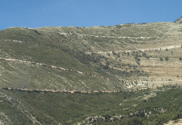 The highest point (top left) where the road goes over the ridge was not the highest point. This mountain was a low spur leading to the highest point at around 2000 metres above sea level. Imagine doing this crossing in winter with a blanket of snow covering the ground.