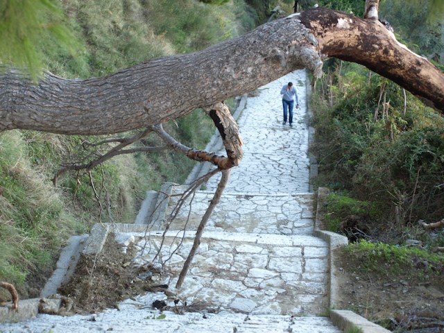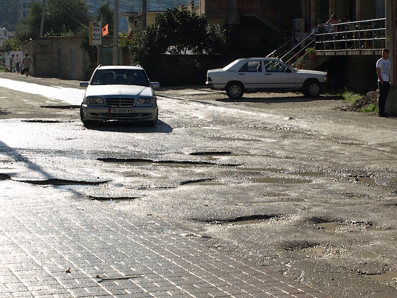 I took these photographs to show how rough some of the roads are in Albania. After I took the latter photo the driver mounted the footpath to avoid the potholes and hit me, fortunately, only with the rear vision mirror. The encounter did more damage to the mirror than to me. I spoke to a local about the incident and was told the driver was probably unlicensed so that’s why he didn’t stop.