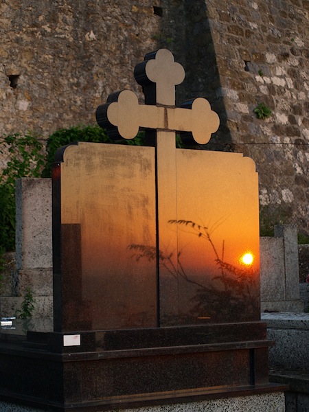 This is the first time I have ever watched the sun set in the east. The reflection is in the back of a polished green granite headstone. If I didn’t have the urge to go into cemeteries I would never have had the chance to witness this dramatic event.