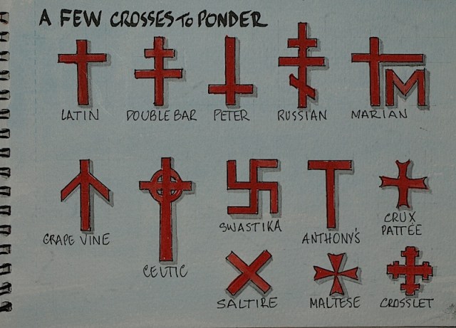 There are a couple of crosses here worthy of comment. The Peter cross is so called because it is believed Peter was crucified upside down. In the Australian outback you sometimes see an upside down cross cutout attached to a gate which is a warning that if you leave the gate open and you are caught you will suffer the same fate as Peter.