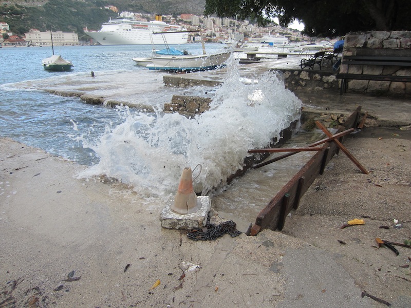 Because the weather was so lousy we decided not to go into Dubrovnik this afternoon but go in tomorrow. So we went to the local supermarket to buy not only food but to get another umbrella as we left the two we bought in Istanbul on the bus this morning. On the way to the supermarket we experienced a near miss with a bolt of lightning. A near miss is when you hear the bang and see the flash at the same time. A little shaken we headed back to the studio and didn’t venture out until late afternoon when we walked along the waterfront just below the apartment.