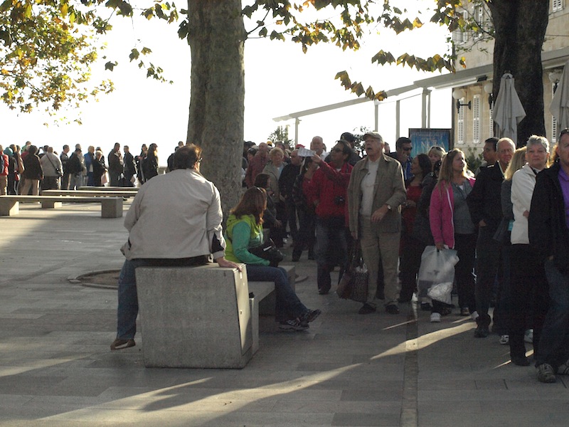 Cruise ship passengers at the end of the day in Dubrovnik waiting to board coaches to be taken back to their floating hotel.