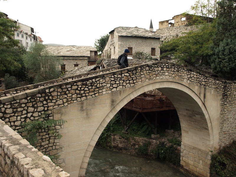 A miniature version of the Mostar Bridge on the east bank. This bridge was also destroyed and rebuilt.