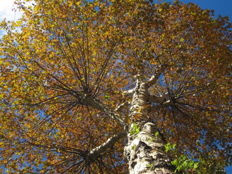 Pollarded plane tree at the wrong bus stop. Had we stood at the right bus stop Bev would not have taken this creative shot.