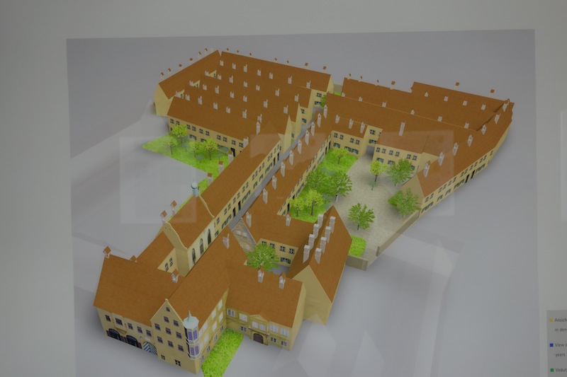 The estate was the brainchild of Jakob Fugger the Rich. In 1521 he founded the estate for needy citizens of Augsburg. It is still operating as it was 491 years ago with an annual rent of one Euro, an equivalent of the rent paid since its establishment. To qualify for the cheap digs the tenant must not be in debt, be a Catholic and pray three times per day for the founder’s family. Presently there are one hundred and fifty people occupying one hundred and forty apartments. The ones not occupied are set up as museum pieces or are used for offices.