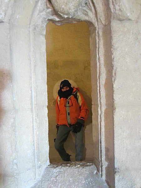 The small room in which I am standing was attached to the chapel. For some unknown reason there was a small circular hole in the castle wall through which a shaft of sun shone through a doorway.