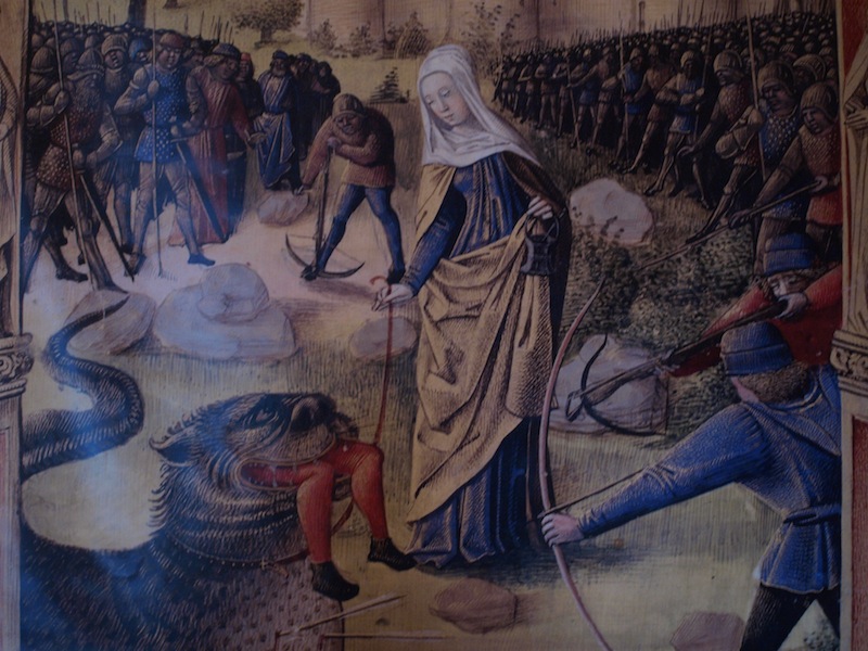 How did St Martha’s Church get its name? The origins of nearly every church in Europe relates to some unbelievable mythical happening and Martha’s church is no exception. The story is as follows. The locals were being terrorised by a beastly dragon but because Martha had supernatural powers she managed to subdue the dragon and bring it to heel. After taming the beast she brought it into town so locals could see it had changed its ways. Unfortunately the locals were not convinced and they killed it. Martha was none too pleased, however she set a good example and forgave them. All around town today there are dragon images. There are fridge magnets, key rings, dragon sculptures, paintings and drawings showing Martha taming the dragon.