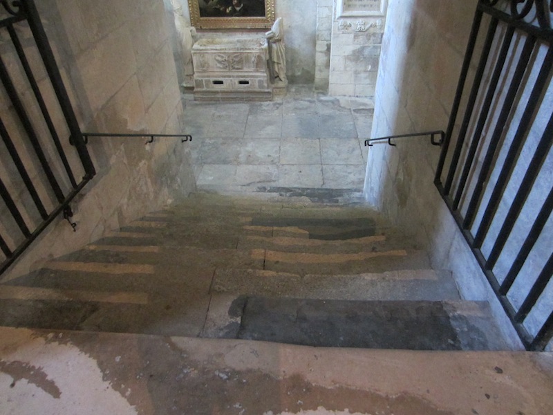 I find it hard to comprehend how many people have gone up and down these steps to wear them to the state they are. Some of the excessively worn marble steps have been replaced with harder basalt (dark grey sections). St Martha’s tomb is against the wall at the bottom of the steps. For the steps to wear to this extent she must have been a popular figure attracting thousands of devotees over the centuries.