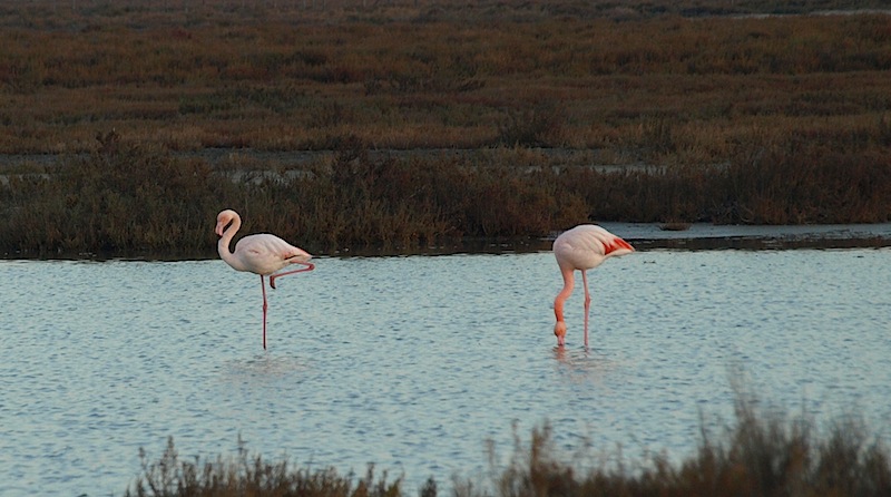 It was just on dusk by the time we left to drive back to Tarascon. The return trip was around one edge of the estuary where we came across a flock of flamingos puddling the bottom and feeding. You will remember back in Leg 3 Monday 27th August 2012 of this blog I explained why flamingos are the colour they are. It is all to do with carotene in the water.