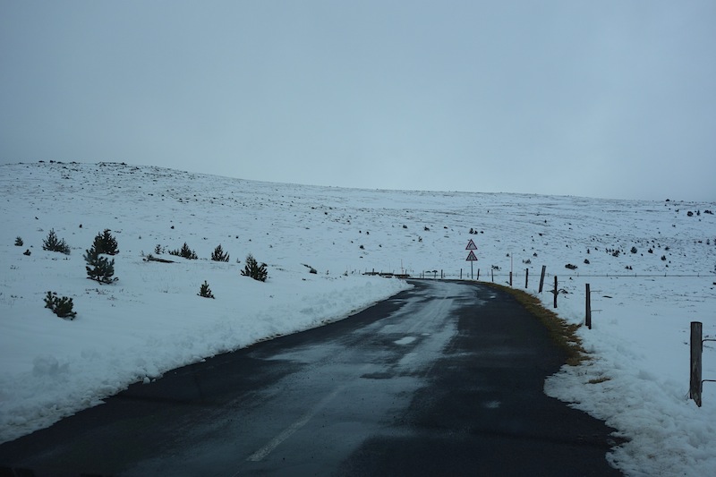 The road at the beginning of the journey from Le Pont-de-Montvert to Le Bleymard (the next town on the trail) did cause us some apprehension as even though the café owner said the road was open we knew that at some point between the two towns we were going to pass near the highest point at Mount Lozere (1699m) and the road could well be icy.